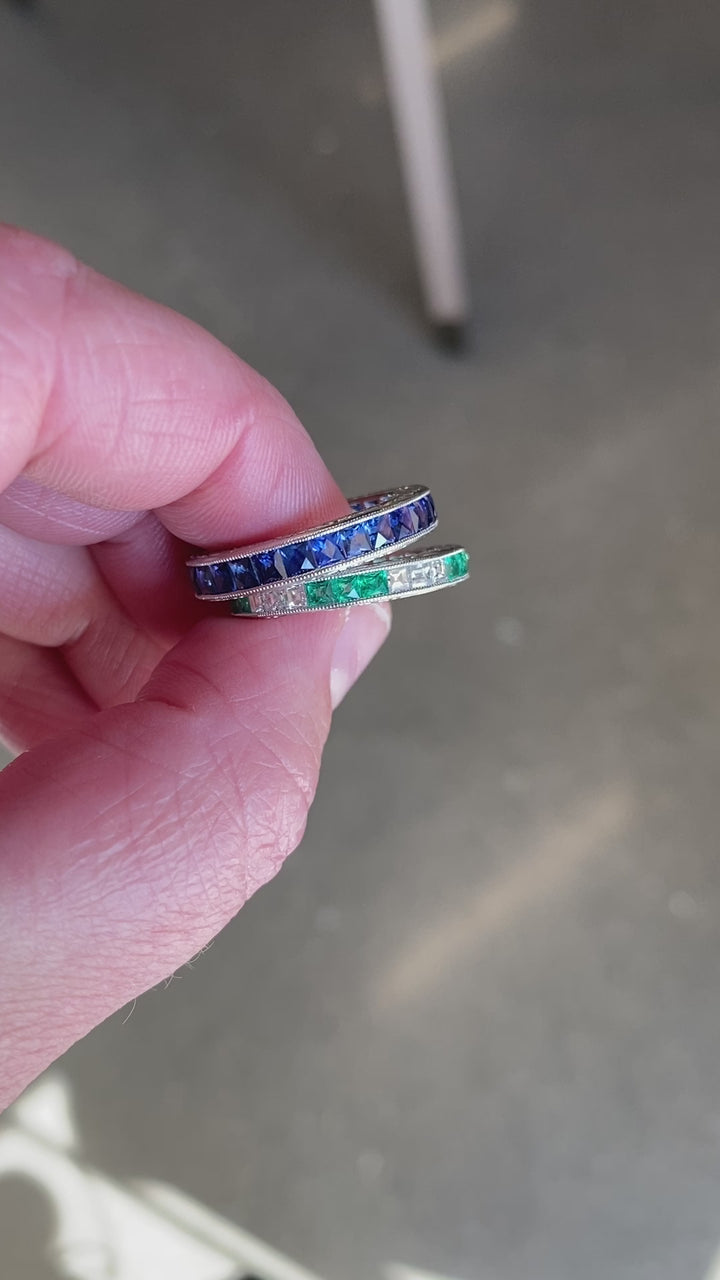 Art Deco Inspired Platinum & Carré Cut Diamond alternating eternity band, 3mm featuring either sapphire, ruby or emerald French Cuts.